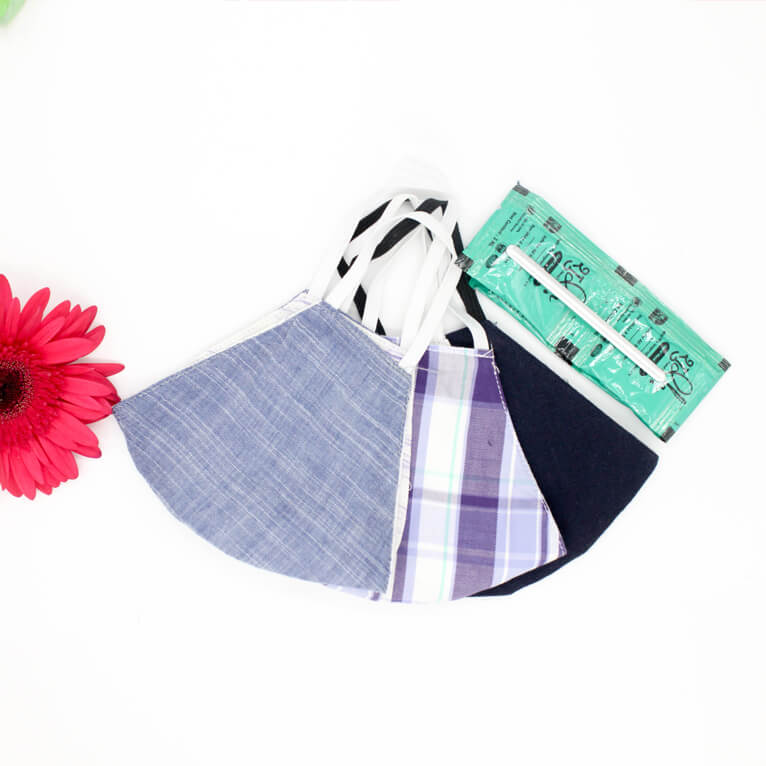 • 1 Light blue abstract , 1 Big Check , 1 Solid Navy blue. All three mask can be used on either side. Giving different look.