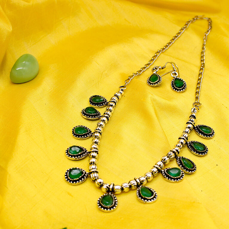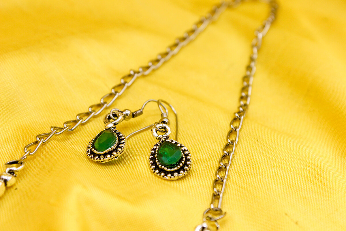 The German Silver green stone droplet earrings complement the heavy look of the neckpiece. You can wear it as a separate jewellery piece as well.